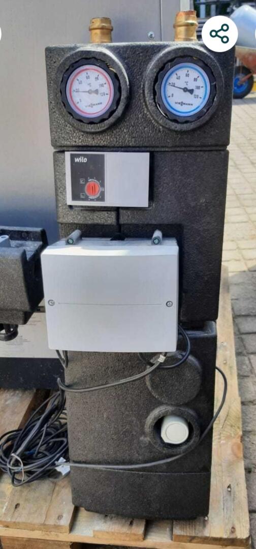 Viessmann Vitoladens 300-C + Vitotronic 200 wraz z oryginalną podstawą i pompą do skroplin. Do tego grupa pompowa Viessmann DIVICON z zaworem trójdrożnym oraz pompą obiegową WILO (rok 2018)